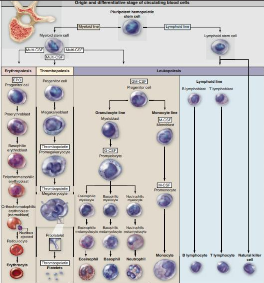 - erythrocytes, eosinophils, neutrophils, basophils, monocytes, and megakaryocytes