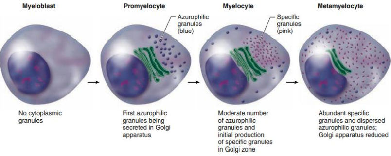 - The first visible sign of this differentiation appears in the myelocyte stage.
